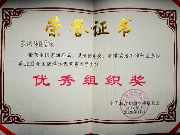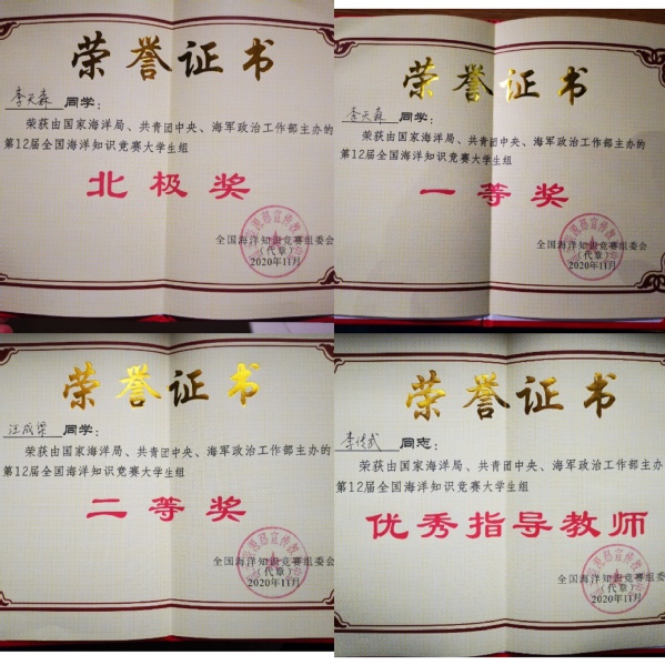 坐标网讯 11月22日,由国家海洋局、共青团中央和海军政治工作部联合主办的第十二届全国海洋知识竞赛总决赛在海南海口市举行,我校城市与规划学院海洋资源开发技术18(6)班学生李天森荣获总决赛一等奖,并入围全国10强赛,荣获全国亚军和三项大奖之一的“北极奖”,获得北极科学考察入场券,地理科学18(1)班汪成梁获二等奖,盐城师范学院还首次荣获全国大学生海洋知识竞赛优秀组织奖,城市与规划学院院长李传武荣获优秀指导教师奖。