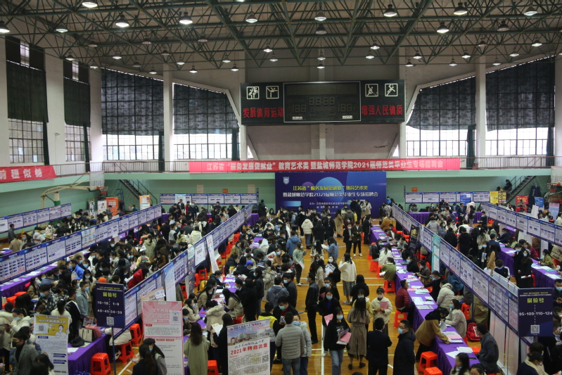 坐标网讯 11月25日上午,我校在通榆校区体育馆举办了江苏省“服务发展促就业”教育艺术类暨盐城师范学院2021届师范类毕业生专场招聘会。来自省内162家中小学、教育机构、企业、人社局进场招聘。本场招聘会提供就业岗位8821个。我校2021届师范类毕业生、部分在盐实习的非师范毕业生计3000余人参加应聘。