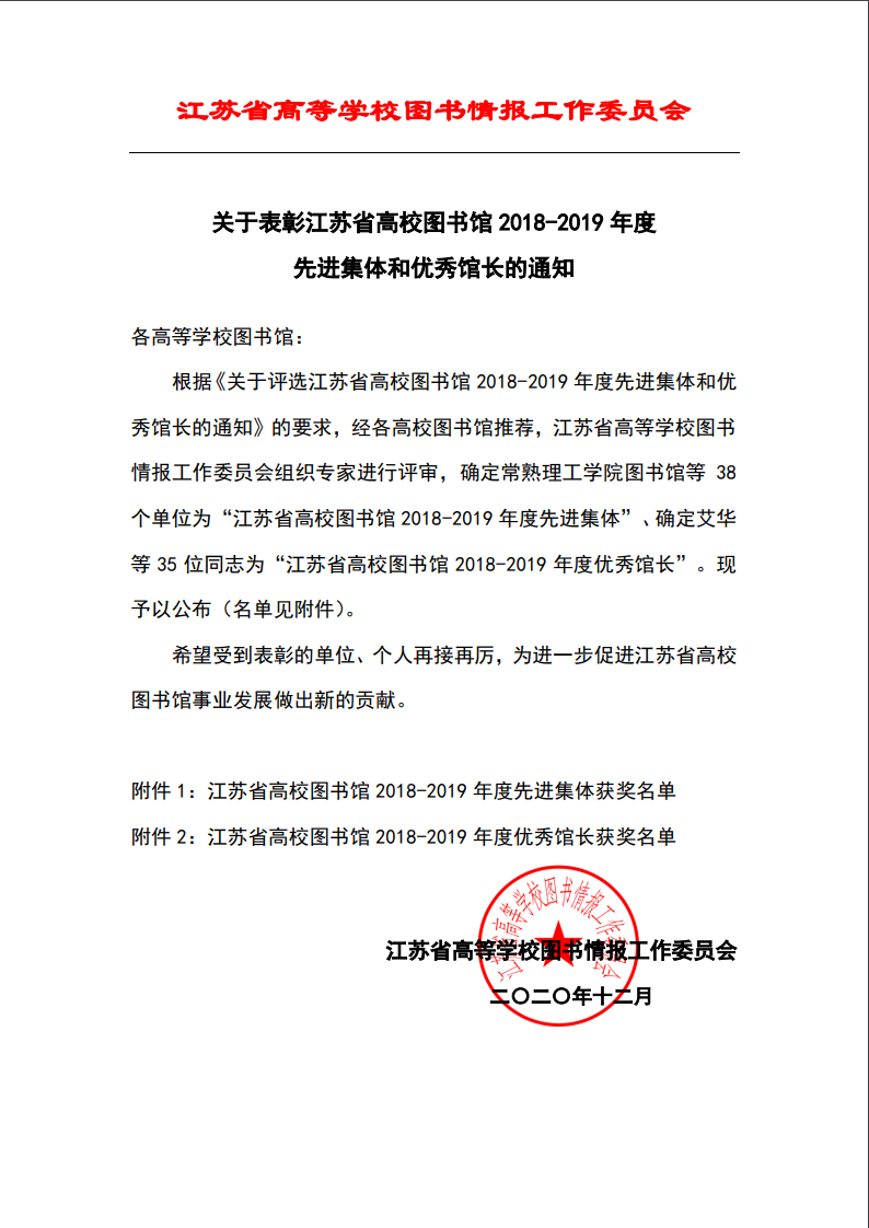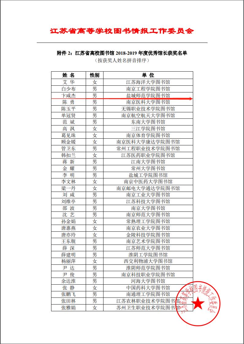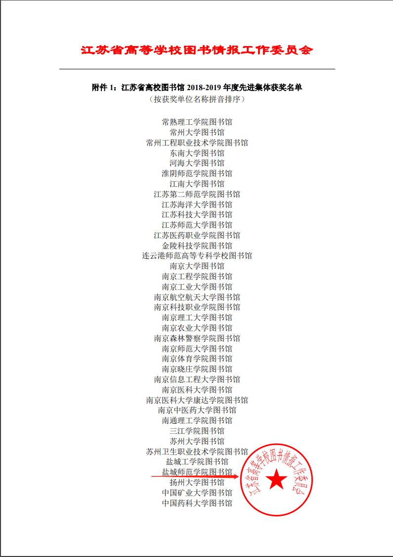 坐标网讯 近日,江苏省高校图书馆2018-2019年度先进集体和优秀馆长的评选结果揭晓。我校图书馆被表彰为“江苏省高校图书馆2018—2019年度先进集体”,图书馆、档案馆馆长卞咸杰同志获评“江苏省高校图书馆2018-2019年度优秀馆长”。全省共有38个单位和35位同志获表彰。