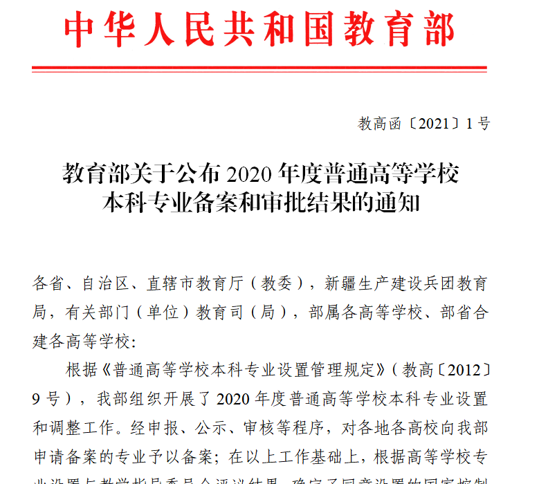 近日,教育部发文公布2020年度普通高等学校本科专业备案和审批结果(教高函〔2021〕1号),我校野生动物与自然保护区管理(090202)和航空服务艺术与管理(130208TK)2个新专业成功通过教育部备案。农学为我校新增学科门类,至此,我校本科专业涵盖经济学、法学、教育学、文学、历史学、理学、工学、农学、管理学、艺术学等10大学科门类。此次新专业申报是我校适应区域经济发展的重大举措,也是我校优化专业结构的重要举措。新专业的获批,为我校进一步凝练专业和办学特色起到了积极的促进作用。