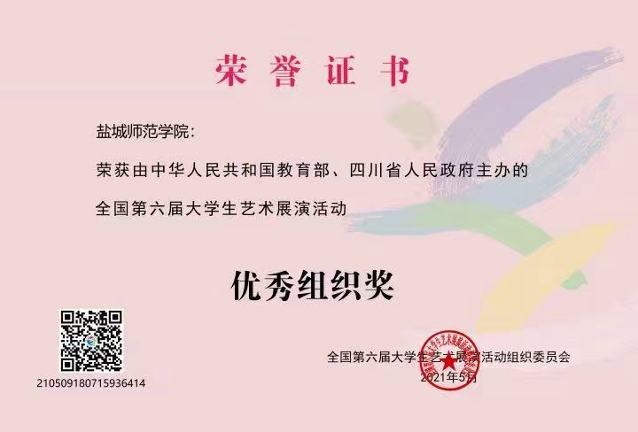 5月6日至5月13日,由教育部、四川省人民政府主办的全国第六届大学生艺术展演活动在四川成都举行。我校首次荣获“全国第六届大学生艺术展演活动优秀组织奖”。