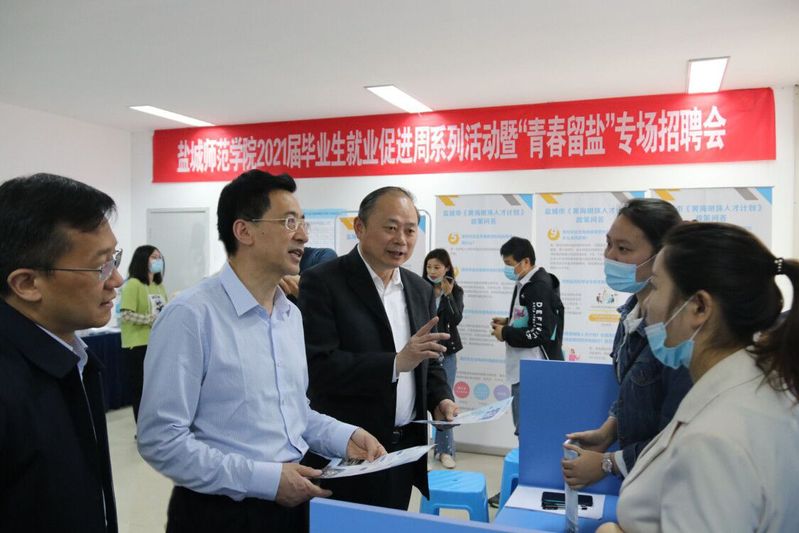 5月19日下午,我校联合盐城市人社局举办“驻盐高校学子留盐行动”专场招聘会。本次招聘会,江苏剑牌农化股份有限公司、江苏润阳光伏科技有限公司、华人运通(江苏)技术有限公司、江苏九阳生物制药有限公司等28家单位参加,提供1327个就业岗位,涉及化学、新能源、电气自动化、生物制药等专业。盐城市人社局党委副书记、省苏北农村人才市场管理委员会办公室主任郑英舜,市委组织部党员干部现代远程教育中心主任倪一华,省沿海人才市场副主任孙众嵚,市委组织部人才工作处二级主任科员吉喆,盐都区人社局副局长王跃军等来校察看招聘会现场。校党委副书记、校长方忠,校党委常委、副校长张桂华到招聘现场指导,并就黄海明珠人才政策宣传、校地合作、平台对接及服务地方经济社会发展等方面与市人社局、市委组织部领导进行了深入交流。