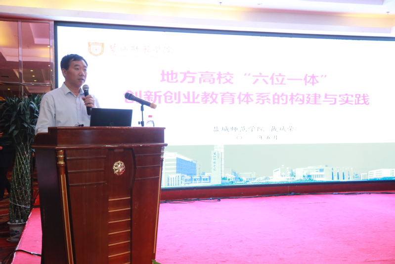 戴斌荣以《地方高校“六位一体”创新创业教育体系的构建与实践》为题作主旨报告,全面系统地介绍了我校创新创业教育的改革理念、思路、举措和成效。他指出,长期以来盐城师范学院坚持“能力为本、重在应用”的原则,基于创新创业教育的生态系统理论,围绕地方高校创新创业教育目标定位,努力构建“双创教学、实践训练、学科竞赛、导师队伍、资源对接、孵化转化”“六位一体”创新创业教育体系,改革举措实,实践效果好。他表示,大学生创新创业其势已成,其风正劲,地方高校要因势而谋、应势而动、顺势而为,凝心聚力、开拓创新、砥砺前行,全力打造以数字化、网络化、智能化为特征的新时代创新创业教育。报告引起与会专家学者强烈反响。