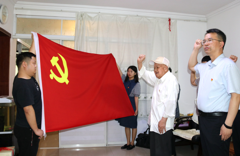 “我志愿加入中国共产党,拥护党的纲领,遵守党的章程,履行党员义务……”这是一场没有蛋糕和蜡烛的生日会,却令人动容,心生感动。鲜红的党旗前,我校95岁离休党员教师包斌握紧右拳,庄严宣誓。“加入中国共产党,不图名不为利。只因感谢党、相信党,从心底里愿意跟党走。”谈及入党初心,包斌心潮澎湃,眼含泪光。