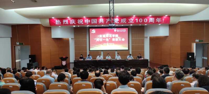 6月30日下午,我校在新长校区图书馆报告厅隆重召开盐城师范学院“两优一先”表彰大会,省委教育工委党史学习教育第五指导组成员,全体在盐校领导,全体中层干部,党支部书记,党员代表,获奖个人和集体代表出席庆祝大会。