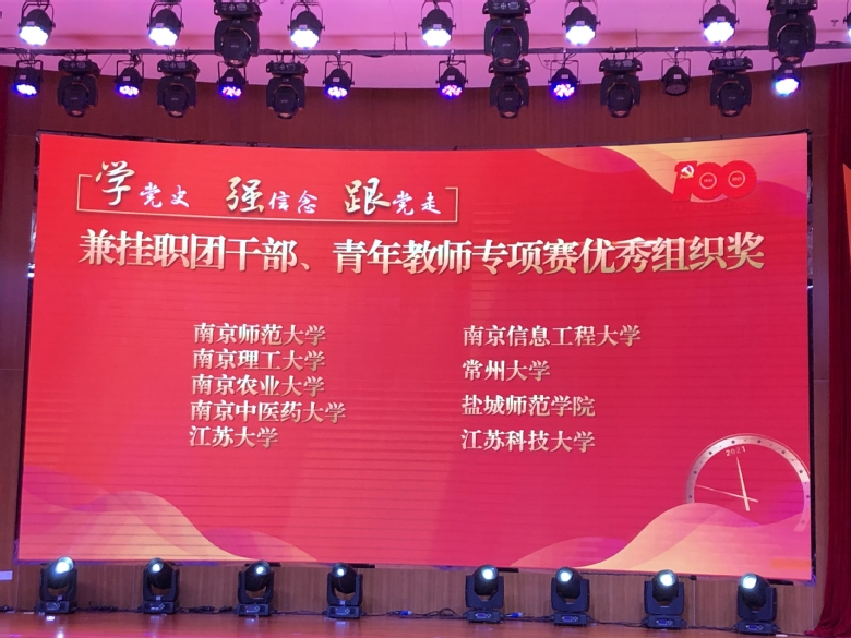7月13日,由共青团江苏省委联合江苏省委教育工委、江苏省委党史工作办公室共同主办的学习宣传贯彻习近平总书记“七一”重要讲话精神学习会暨“学党史、强信念、跟党走”江苏高校百校万名团干部思政技能大比武专职团干部和兼挂职团干部、青年教师专项赛在南京师范大学仙林校区举行,我校团干表现优异,荣获一等奖1项、二等奖1项、三等奖2项,学校荣获兼挂职团干部、青年教师专项赛优秀组织奖。