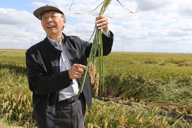 我校特聘教授茆训东带着几位博硕士在万亩废弃盐田上开始实验“废弃盐田重盐土快速高效垦殖技术及模式创新”研究课题。茆训东团队积极打好水源保障、灌排配套、土地平整、电通路畅4项基础,采取耕、晒、泡、旋、排快速高效排盐法,实施深松、勤灌、多旋、良种、密植、足肥6项配套技术,对水稻病虫草害的防治进行专家会诊,做到因地、因苗、因虫、因草制宜,及时制定和修正用药方案和防治办法。经过悉心管理,2017年,试验田块实现了改良水稻最高亩产达659.6公斤。2018年,水稻最高产量达到737.5公斤。