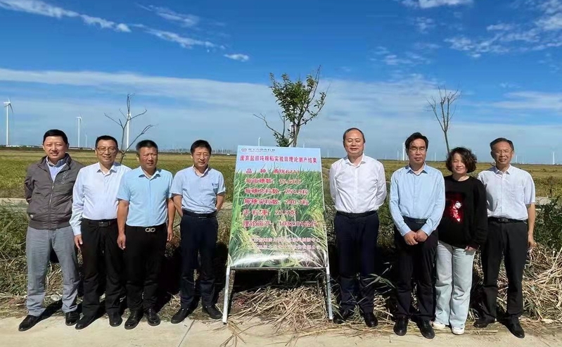 这片位于盐城射阳顺泰二场的试验稻田一望无际,湛蓝的天空下,黄灿灿的稻穗,与田埂上高大的盐地碱蓬和远方成排的风力发电机组,组成了这个秋天里最美的画卷。在9月份的前期理论测产中取得了理想的产量,结果显示种植甬优6711和甬优4953的两块废弃盐田理论亩产分别为1032.01公斤和1103.25公斤,均超过了一千公斤,实现了单季吨粮稻的预订目标。在此基础上,当天下午,专家组一行前往顺泰二场,对水稻进行实地测产核验,认定该技术该技术体系先进、实用,对提高盐碱地大面积水稻产量具有重要推广价值。