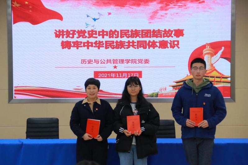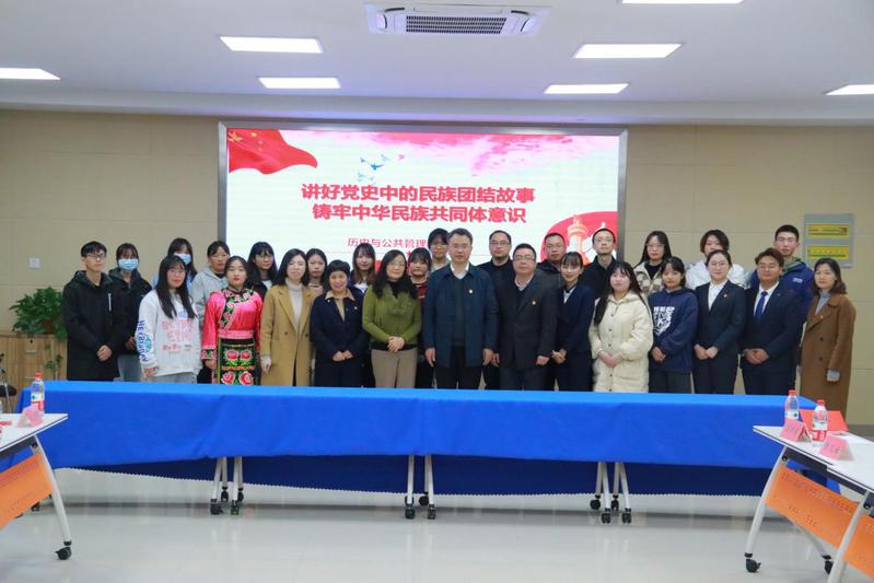 历史与公共管理学院举行党员师生与2021级少数民族新生结对仪式暨“讲好党史中的民族团结故事,铸牢中华民族共同体意识”活动。活动中,学院师生党员与少数民族学生逐一结对,教师党员代表、学院院长陆玉芹、学生党员代表唐前程还与少数民族学生蒙玉茗现场交换了结对卡片。同时,大家纷纷结合自己实际,讲述了很多感人至深的民族团结故事。学生党员梁亚菲、学院党史宣讲团成员王韩、严旭、苗族学生代表蒋琳燕、羌族学生代表马继明从历史的角度分别向大家讲述了《土尔扈特万里东归》、《三千孤儿入内蒙》、《彝海结盟》、《主席送毛衣 情暖清江水》、《北川人民与红军》的故事;学生党员唐前程、回族学生代表杨硕、彝族学生代表王珣则分别结合亲身经历,分别讲述了《新疆支教万里情》、《有一片热土叫宁夏,有一份深情叫党恩》、《守护“阿者科”乡愁的旅游村长》等故事,尤其是彝族学生代表王珣讲的《守护“阿者科”乡愁的旅游村长》故事,更是深情地讲述了自己的哥哥、我校2008届优秀校友王然玄毕业后回到家乡,扎根基层,用诚挚的初心守护阿者科的那一份“乡愁”,带领乡民们脱贫致富的奋斗故事。
