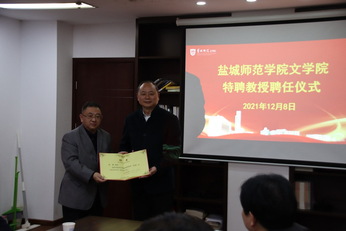 近日,我校在通榆校区主楼B611会议室举行聘任仪式。教育部“长江学者”特聘教授、北京师范大学鲁迅研究中心主任、马工程“20世纪中国文学史”首席专家、国家社科重大项目首席专家、中国现代文学研究会常务副会长刘勇教授受聘为我校特聘教授。学校党委副书记、校长方忠出席聘任仪式并讲话,文学院院长李尧主持聘任仪式。