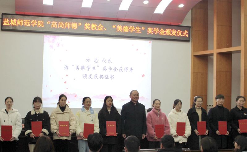 12月22日下午,我校第三届“高尚师德”奖教金、“美德学生”奖学金颁发仪式在新长校区厚德楼举行。江苏省教育基金会常务副理事长眭平,党委副书记、校长方忠,党委常委、副校长张桂华,党委常委、副校长毕凤珊出席颁发仪式。颁奖仪式由毕凤珊主持。