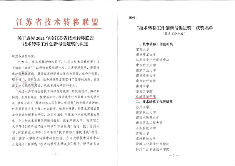 1月18日,江苏省技术转移联盟2021年年会在南京召开。我校荣获“技术转移工作创新奖”,是该联盟175个成员单位中获此殊荣的10个单位之一。