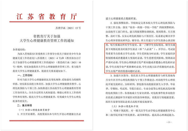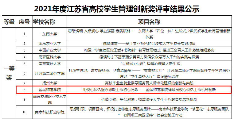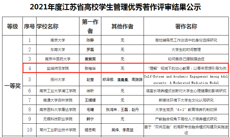近日,2021年度江苏省高校学生管理创新奖及优秀著作评选活动结果公布。我校推荐申报的《用谈心谈话坚守思政工作初心使命——盐城师范学院辅导员谈心谈话工作机制创新》获评2021年度江苏省高校学生管理创新奖一等奖;论文《“理解”视域下的谈心教育:以青年思想引导为例》(作者:张桂华)获评2021年度江苏省高校学生管理优秀著作一等奖。