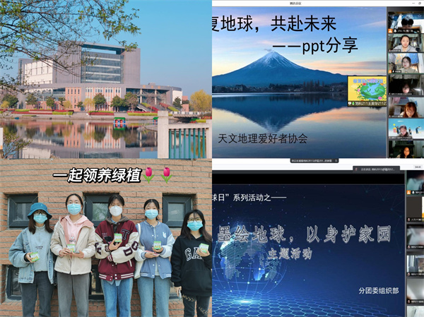 一次主题活动宣讲,激发保护环境意识。4月17日,学院天文地理爱好者协会举办 “修复地球,共赴未来”主题活动。通过《修复我们的地球》线上主题宣讲,线下领养绿植、清理校园垃圾、整理共享单车等方式号召同学们争做“生态优先,绿色发展”的践行者。