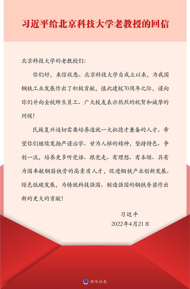 4月21日,习近平总书记给北京科技大学的老教授回信,对培养更多高素质人才,促进钢铁产业创新发展、绿色低碳发展提出殷切期望。习近平总书记在回信中强调,民族复兴迫切需要培养造就一大批德才兼备的人才,希望老教授们继续发扬严谨治学、甘为人梯的精神,坚持特色、争创一流,培养更多听党话、跟党走、有理想、有本领、具有为国奉献钢筋铁骨的高素质人才,促进钢铁产业创新发展、绿色低碳发展,为铸就科技强国、制造强国的钢铁脊梁作出新的更大的贡献。