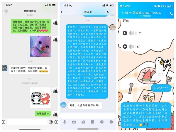 本次主题活动以2022届毕业生通过便签、短信、电话给老师送祝福语的形式展开。一条条温馨的祝福语,道出了同学们依依不舍的师生情,饱含同学们对老师的真挚感谢和敬意,也饱含大学四年生活的点点滴滴,以及与老师们相伴偕行的朝朝暮暮。感恩相识,不负遇见,继续前行,未来可期!