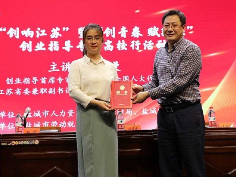 招生就业处处长刘海燕介绍了我校在创新创业教育方面的扎实举措及取得的成绩。市人社局劳动就业中心副主任张晔介绍了我市创业情况、创业政策,鼓励大学生要勇于挑战,敢于创新,希望更多的学生留盐就业创业。