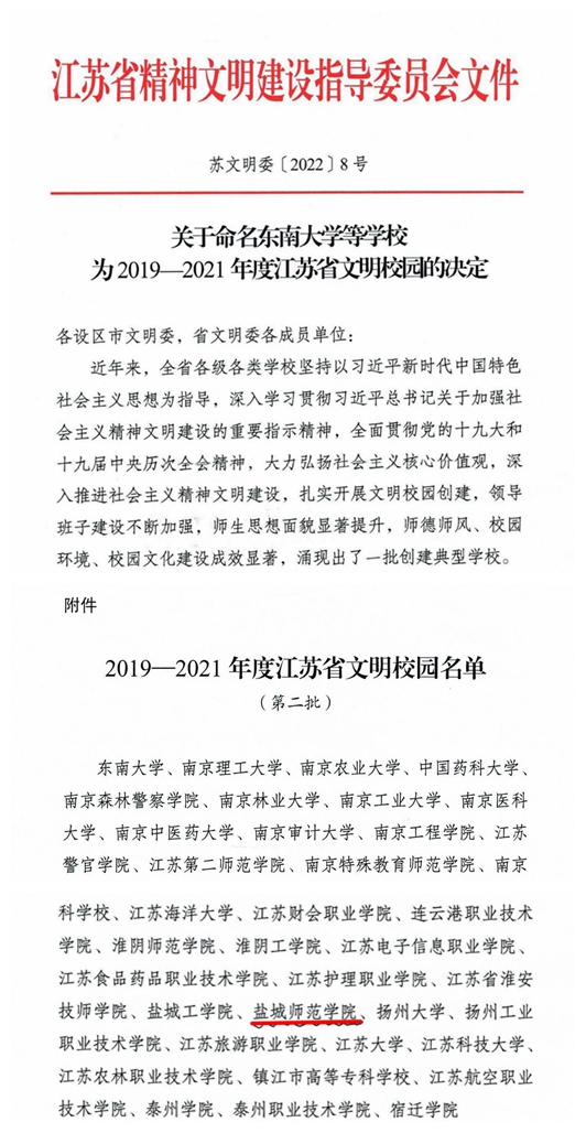 日前,江苏省精神文明建设指导委员会印发《关于命名东南大学等学校为2019—2021年度江苏省文明校园的决定》,我校荣获2019-2021年度江苏省文明校园称号。