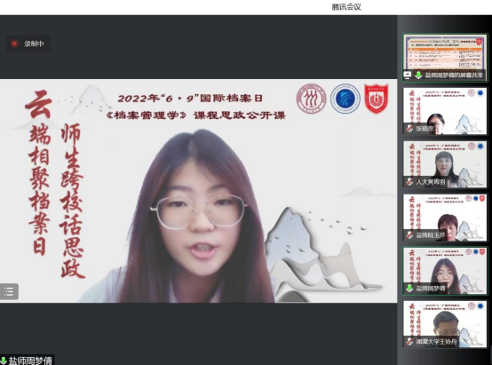 今年6月9日是第十五个国际档案日,围绕“喜迎二十大·档案颂辉煌”的主题,我校历史与公共管理学院与中国人民大学信息资源管理学院共同举办“云端相聚档案日,师生跨校话思政”线上课程思政主题公开课。来自中国人民大学信息资源管理学院和我校历史与公共管理学院档案学师生及武汉大学、湘潭大学等高校相关领域的专家学者260余人参加了此次公开课。