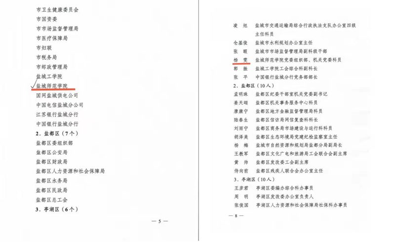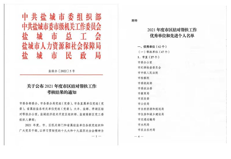 近日,中共盐城市委组织部、中共盐城市委市级机关工作委员会等五部门联合下发《关于公布2021年度市区结对帮扶工作考核结果的通知》(盐结办〔2022〕5号),表扬在2021年度深入开展结对帮扶城市困难家庭活动中表现突出的先进集体和先进个人。我校荣获“2021年度市区结对帮扶工作优秀单位”称号,党委组织部、机关党委杨雯同志被表彰为2021年度市区结对帮扶工作先进个人。