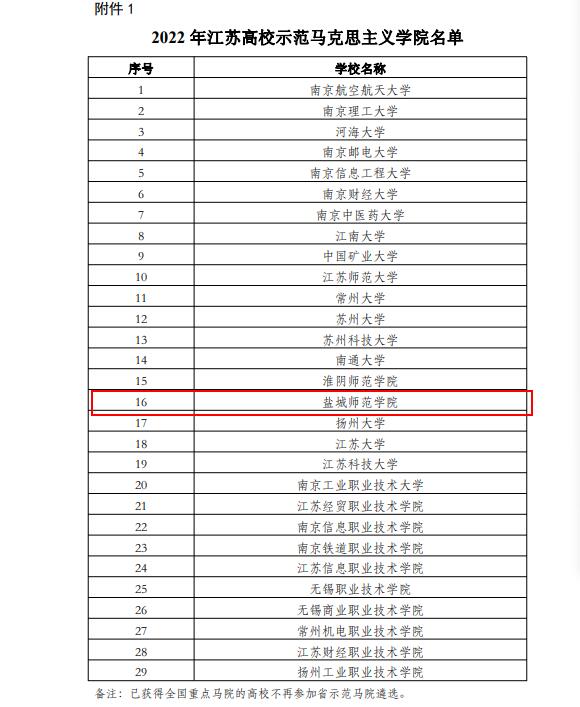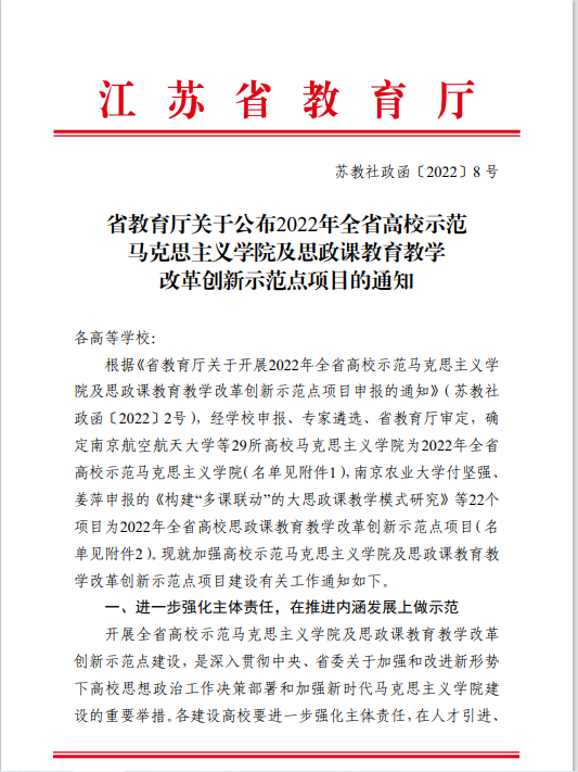 近日,江苏省教育厅印发《关于公布2022年全省高校示范马克思主义学院及思政课教育教学改革创新示范点项目的通知》(苏教社政函〔2022〕8 号),确定29所高校马克思主义学院为2022年全省高校示范马克思主义学院。我校马克思主义学院继2016年、2018年、2020年之后,连续第4次获此殊荣。