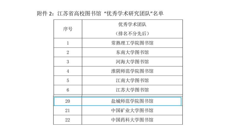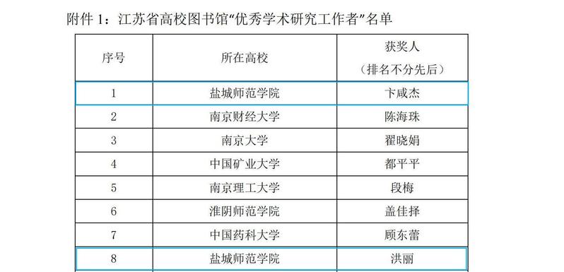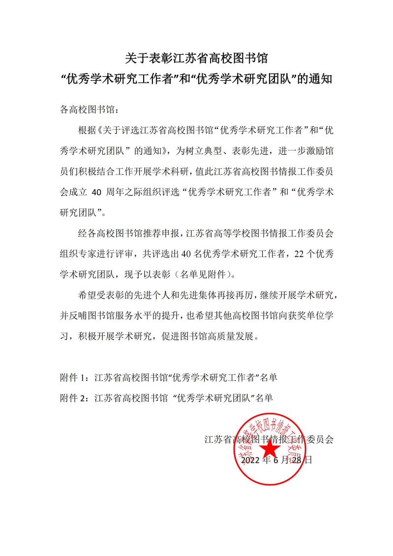 经各高校图书馆推荐申报,江苏省高等学校图书情报工作委员会组织专家进行评审,共评选出22个优秀学术研究团队,40名优秀学术研究工作者,其中我校图书馆被表彰为江苏省高校图书馆“优秀学术研究团队”,卞咸杰、洪丽两位同志被表彰为“优秀学术研究工作者”。