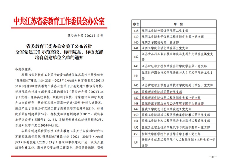 以主题党日活动为载体,提升组织活力。深入开展党史学习教育,组织师生深入红色基地,实地学习党史,先后走进上海中共一大纪念馆、山东台儿庄大战纪念馆、盐城新四军纪念馆、新四军军部旧址、五条岭烈士陵园、中国工农红军第十四军纪念馆、周恩来纪念馆、周恩来故居等地,让党员“动”起来,让党史学习教育“活”起来。“盐师红”引领“青春红”主题党日活动,将党史学习与校史学习相结合,深挖“盐师精神”、探访红色基地,搭建校友数据库、形成“盐师”影响力。学院《‘强理论,强党性’,做双强共产党员》《在疫情防控中勇担使命,在服务师生中争做先锋》《“盐师红”引领“青春红”》党日活动获校“最佳党日活动”一等奖。