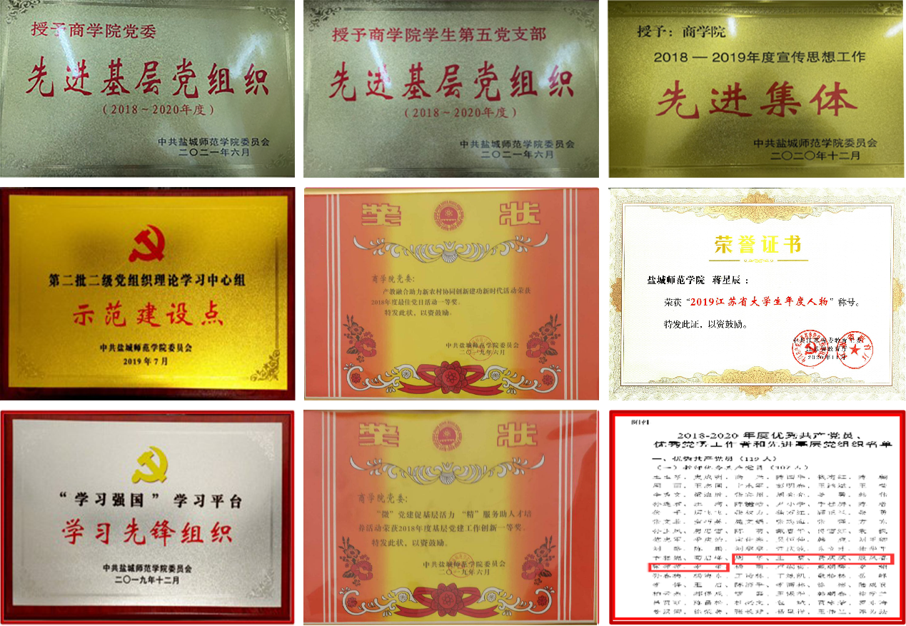 通过“不忘初心、牢记使命”主题教育和党史学习教育,主动对标争先、强基创优。四年来,学院党委先后荣获校先进基层党组织、校基层服务型党组织示范点创建单位、理论中心组学习示范建设点、“学习强国”平台学习先进集体、宣传思想工作先进集体。深入实施“一个总支一个特色、一个支部一个亮点”工程,强化基层党组织建设,获批校“书记项目”重点项目4项。基层党建工作创新奖特等奖1个、一等奖1个、二等奖2个;最佳党日活动特等奖1个、一等奖1个、二等奖2个,发表省级以上党建论文15篇。1个党支部获校2020年“双带头人”教师党支部书记工作室创建单位,2个支部获评校优质党支部。涌现出一批先进典型和先锋模范。我院杰出校友包斌、陆一军夫妇获第七届全国道德模范提名奖,纪峰同志被表彰为盐城市“文明职工”,林小兰同志、殷凤春同志分别获得2020年、2021年省教育基金会颁发的“高尚师德”奖教金。范华莉同志获“盐城市创建全国文明城市先进个人”。学生党员蒋星辰荣获“2019江苏省大学生年度人物”,系我校首次获此殊荣。