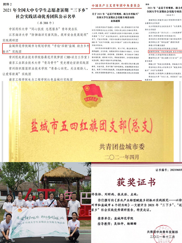 学生实践活动质效显著提升。学生志愿服务和社会实践活动紧密结合专业,传承红色精神,投身基础教育,助力乡村振兴,建设美丽中国,活动多次获团中央、团省委表彰,获全国、全省大中专生暑期“三下乡”优秀社会实践团队,全国、全省优秀社会实践调研报告,江苏省社会实践先进工作者和先进个人,江苏省抗疫先进个人、盐城市创建全国文明城市优秀志愿者等荣誉。学院已连续9年举办生态文化节,分团委获盐城市五四红旗团总支,水文化研究协会获全国大学生环保知识竞赛优秀协办单位。多名学生疫情防控、励志成才等事迹被《人民日报》《中国青年报》《学习强国》《交汇点新闻》报道,收到市县区政府的表扬信和感谢信百余份。