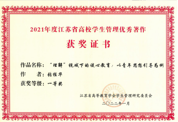 2018年以来,学生工作处组织开展校级专题辅导员沙龙30余次,校级专题培训、交流18场,新老“结对”传帮带,辅导员队伍聚焦主责主业的思想意识和工作能力显著提升。5人次获批教育部人文社会科学研究专项任务项目;1人获第十一届“江苏省辅导员年度人物”提名奖;1人获第十二届“江苏省高校辅导员年度人物”;1人获第九届江苏高校辅导员素质能力大赛二等奖。