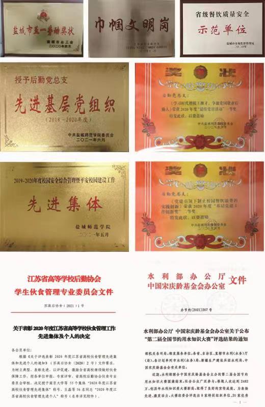 四年来,学校获评首批江苏省绿色学校、全国节约用水知识大赛优秀组织单位,后勤保障集团荣获省高校伙食管理工作先进集体,卫生所荣获盐城市“五一劳动奖状”、江苏省“巾帼文明岗”,学校食堂荣获“省级餐饮质量安全示范食堂”,后勤党总支荣获先进基层党组织、党建工作创新奖二等奖、最佳党日活动一等奖等荣誉。