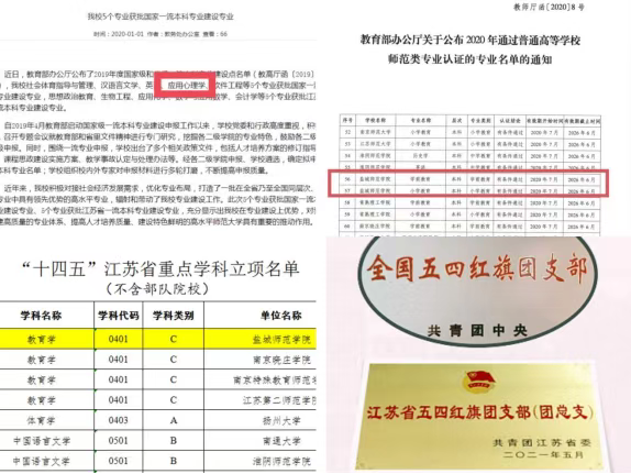 在政治建设引领下,学院事业取得了巨大发展。专业建设方面,学院以优异的成绩通过学前教育专业、小学教育专业的全国师范专业认证,获批应用心理学专业国家一流本科专业建设点,小教专业省一流专业;学科建设方面成绩优异,教育学“十三五”省重点建设学科以“优秀”等级通过终极验收,成功获批“十四五”省重点学科,省级一流课程3项;优秀教学团队成果斐然,“乡村卓越教师教育基础课程群”团队2018年获评省“青蓝工程”优秀教学团队(2020年以“优秀”等级通过验收),获批省高校哲社优秀创新团队;学院团学工作成绩显著,学院团委被评为江苏省五四红旗团委,盐城市五四红旗团总支,1个团支部被团中央表彰为“活力团支部”。