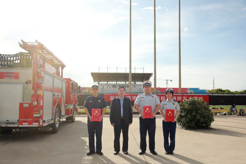 盐城市消防救援支队、学校消防工作人员和消防维保单位人员通过理论宣讲、实验演示、消防疏散逃生演练等方式,向学生讲解火灾事故预防、安全自救逃生等消防安全知识以及灭火器、防护面罩等消防器具的使用方法,开展灭火实践操作演练,提高学生对突发火情的扑救能力。演练结束后,庞校长为参与演练的盐南高新区消防救援大队三位同志颁发了校外消防辅导员聘书。