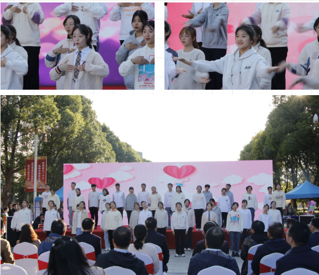 来自不同学院的30多名学生用“心”赋能手语操表演《还有我》,传递温暖、传递正能量;信息工程学院黄瑞同学作为宿舍心理气象员代表宣读倡议书《捕捉心理“异”象 共助心理健康》。