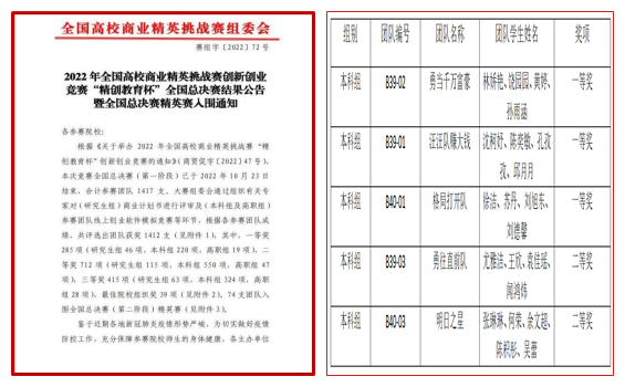 10月22-23日,我校商学院组建的5支团队在2022年全国高校商业精英挑战赛创新创业竞赛“精创教育杯”全国总决赛本科组赛道中获得历史最佳成绩,其中一等奖3项,二等奖2项。21名参赛同学全部获奖,获奖率100%。