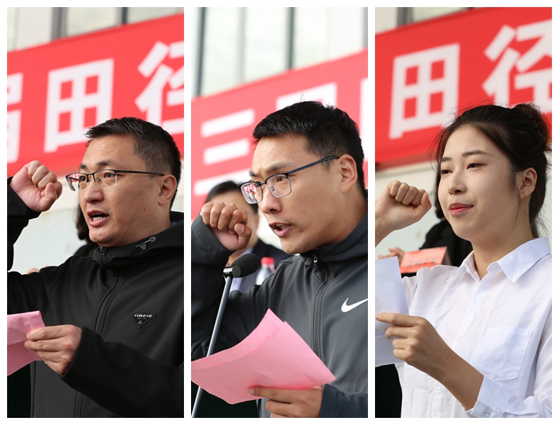 文学院郑雅倩同学、评估处刘井飞老师、体育学院刘跃老师先后代表学生运动员、教职工运动员、裁判员宣誓。