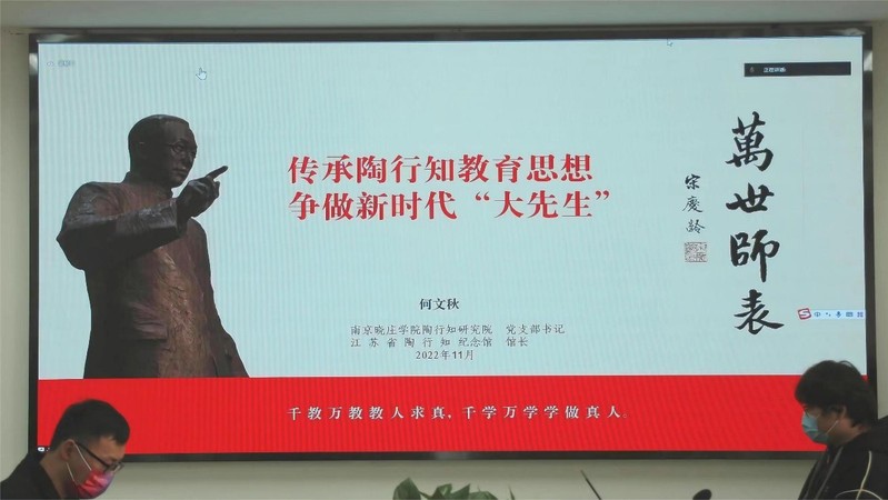 培训班第一讲邀请南京晓庄学院陶行知研究院党支部书记何文秋教授作题为《传承陶行知教育思想争做新时代“大先生”》的专题辅导。他从陶行知生活教育理论中的“教学做合一”展开探讨,并融合党的二十大有关教育理念对陶行知教育思想作了丰富的阐释。何文秋勉励全体辅导员继续赓续百年初心,担当育人使命,用榜样的力量去引导学生,做学生为学、为事、为人的“大先生”。