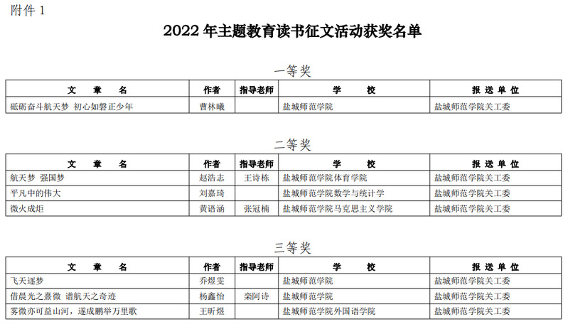 根据省教育系统关工委统一部署,我校关工委在各二级学院中广泛开展《勋章》和《逐梦九天》读书活动,并以“平凡中的伟大”和“航天梦 强国梦”为主题开展征文活动。青年学子们踊跃投稿, 校关工委组织遴选出20篇优秀作品参加比赛。经省专家组多轮评审,我校7名同学在此次征文活动中获奖,其中一等奖1名,二等奖3名,三等奖3名。