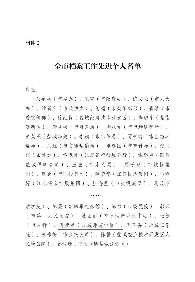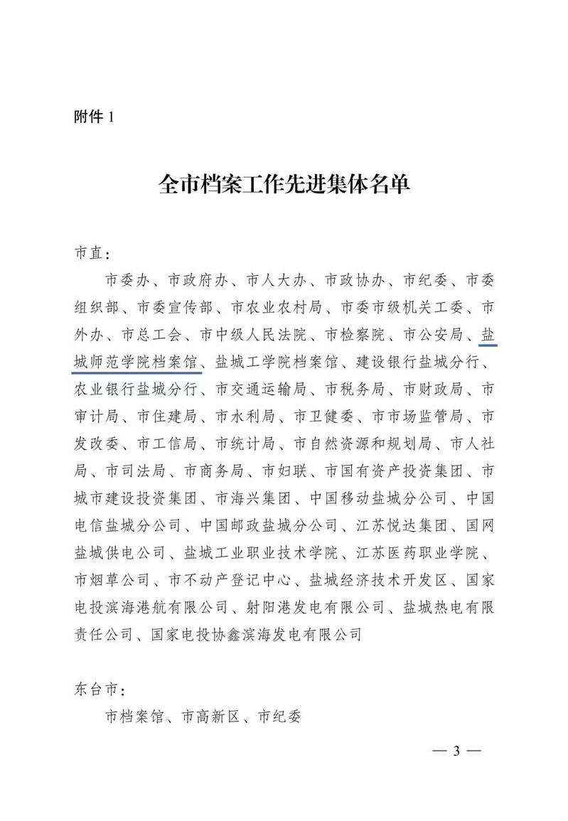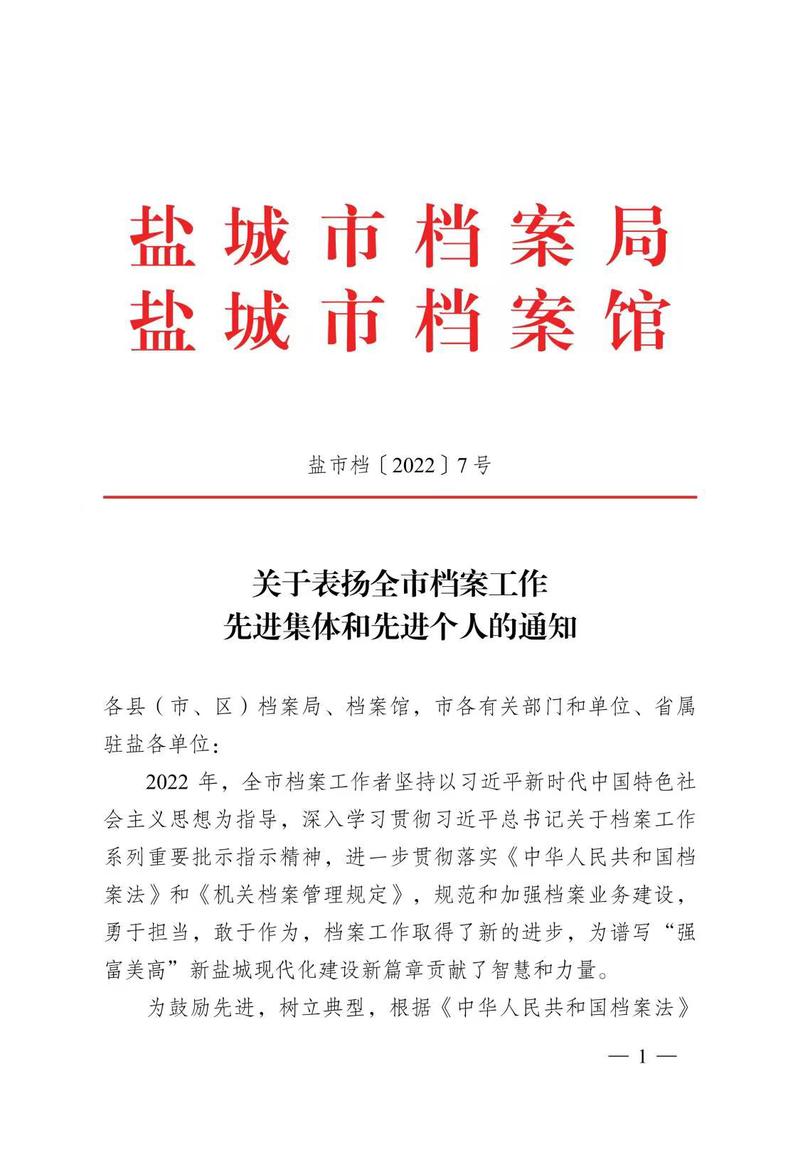 为鼓励先进,树立典型,根据《中华人民共和国档案法》和国家档案局第13号令《机关档案管理规定》相关规定,盐城市档案局、盐城市档案馆对2022年全市档案工作中表现突出的先进集体和先进个人予以表扬。我校档案馆荣获盐城市档案工作先进集体,1人荣获盐城市档案工作先进个人。