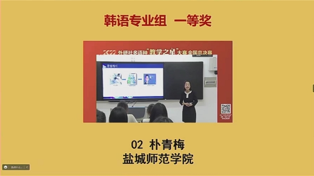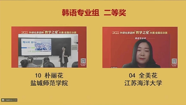 12月17日,由北京外国语大学中国外语与教育研究中心、北京外国语大学中国外语教材研究中心、外语教学与研究出版社主办的多语种“教学之星”大赛韩语专业组全国总决赛成功落下帷幕,我校外国语学院朝鲜语专业教师朴青梅获韩语专业组全国总决赛一等奖,朴丽花获二等奖。