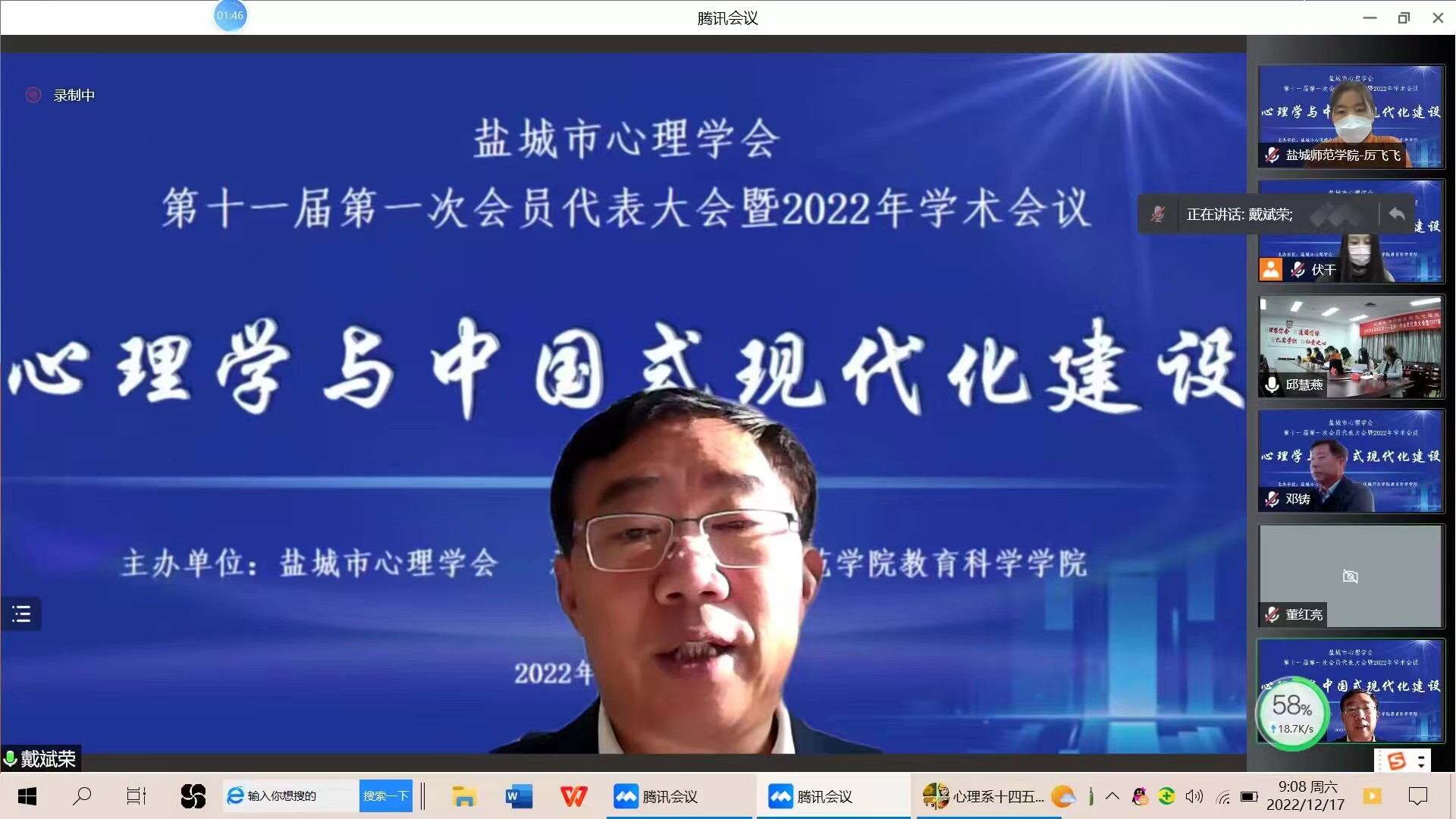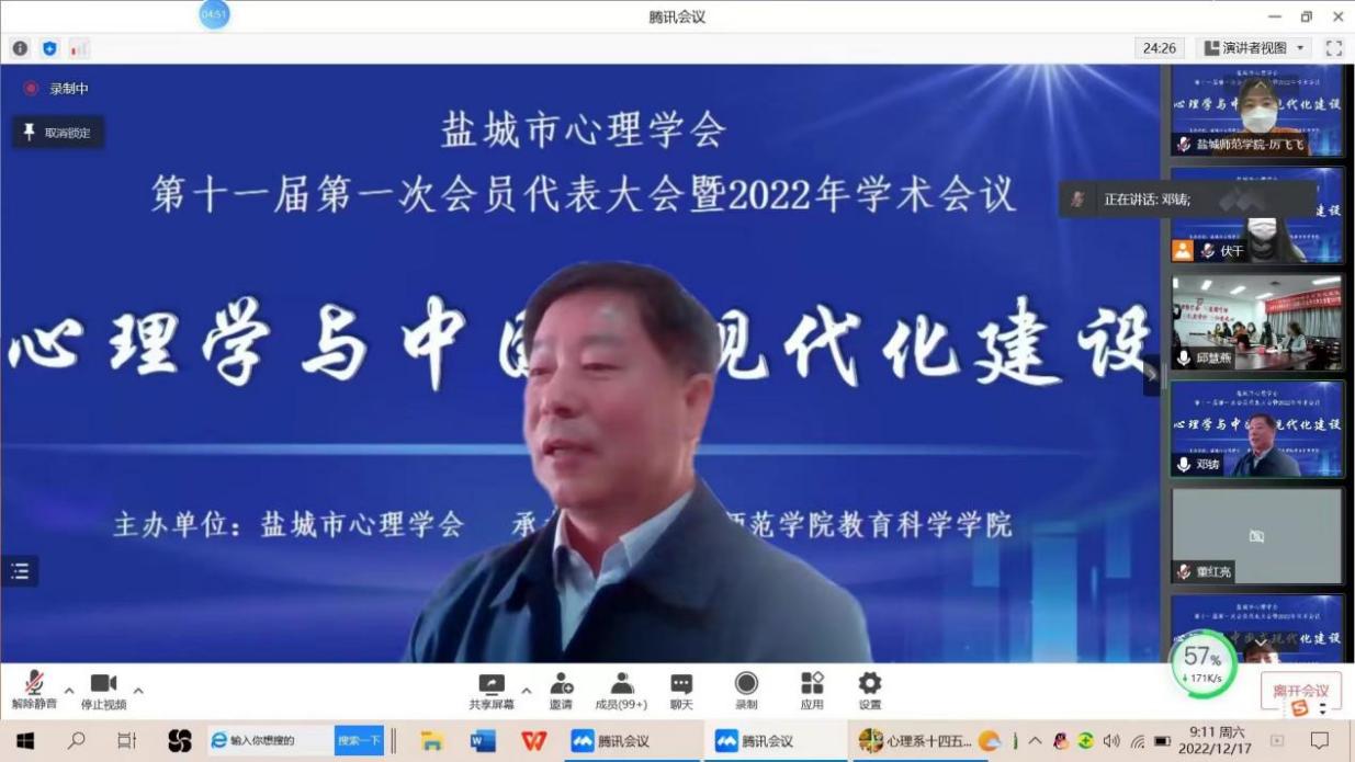 12月17日,由盐城师范学院教育科学学院承办的盐城市心理学会第十一届第一次会员代表大会暨2022年学术会议顺利召开,理事候选人和会员大会代表共200多人线上线下参加本次会议。学校党委书记戴斌荣出席开幕式并致辞。