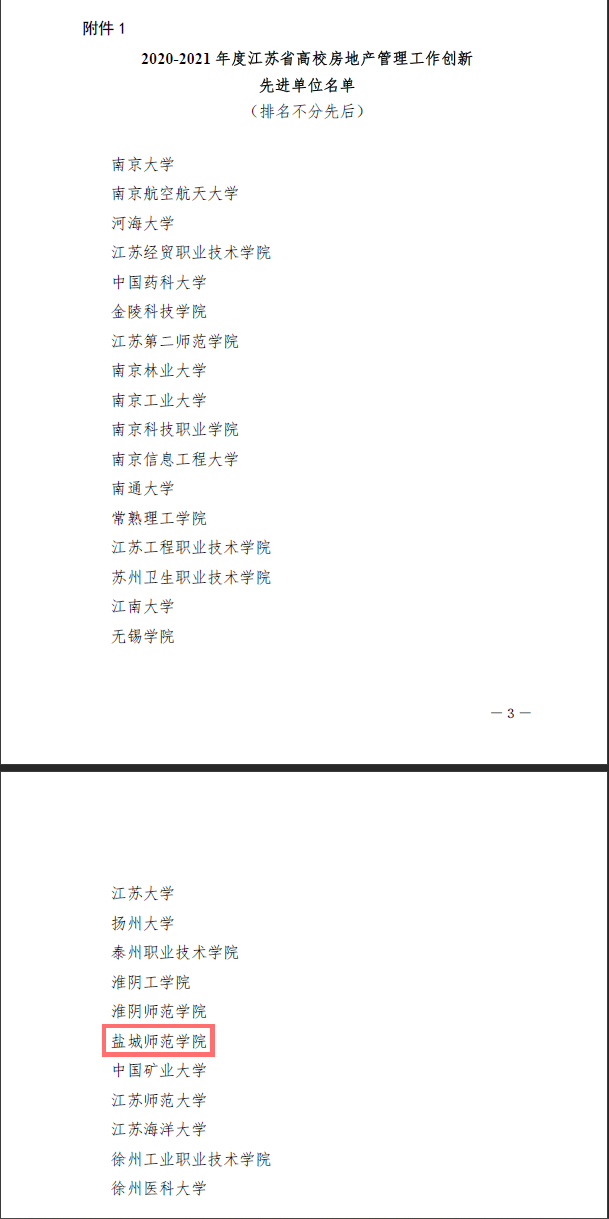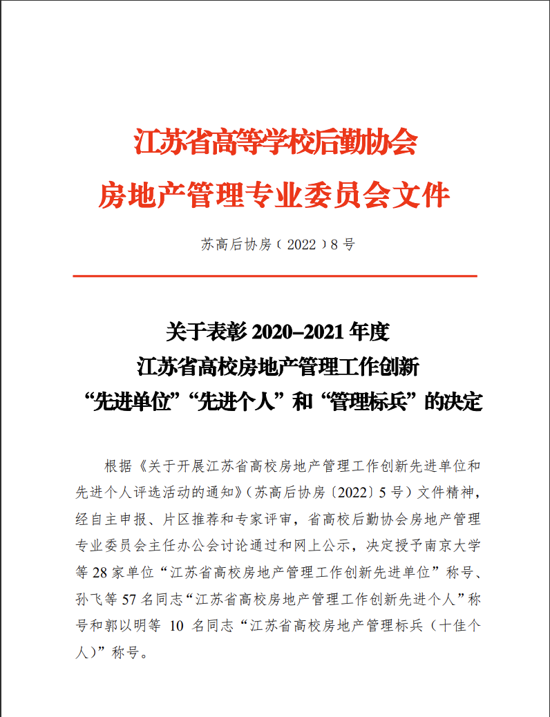 近日,江苏省高等学校后勤协会房地产管理专业委员会发布《关于表彰2020-2021年度江苏省高校房地产管理工作创新“先进单位”“先进个人”和“管理标兵”的决定》,对全省各高校在房地产管理方面涌现出的先进集体和个人进行表彰。我校获评江苏省高校房地产管理工作创新“先进单位”,全省28家高校获此殊荣。