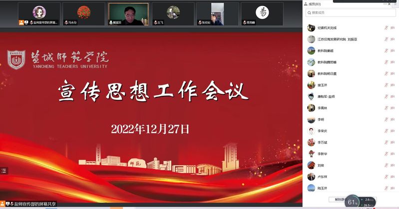 为深入学习贯彻党的二十大精神和学校第四次党代会精神,全面贯彻党的教育方针,落实立德树人根本任务,不断提升学校宣传思想工作质量和水平,12月27日上午,学校通过腾讯会议召开宣传思想工作会议。学校党委书记戴斌荣出席会议并讲话,党委副书记、校长张宏如主持会议。