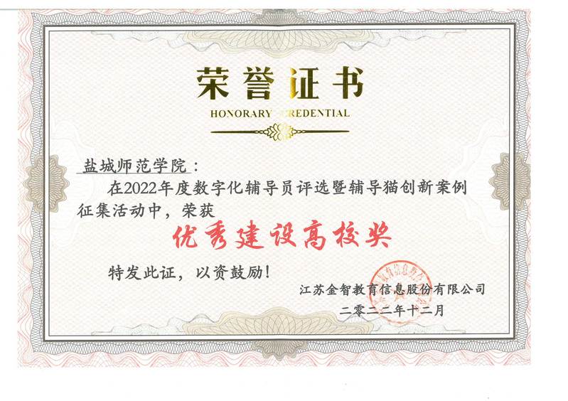 在金智教育主办的2022年度全国高校数字化辅导员评选暨辅导猫创新案例征集活动中,我校制作的微视频作品《辅导员的网络思政育人之路》荣获“优秀建设高校奖”,该作品将入选辅导猫案例库,面向全国宣传推广。