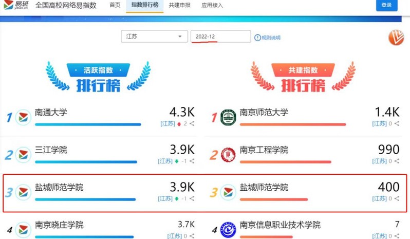 日前,教育部易班发展中心公布了2022年12月全国高校网络易指数排行,我校活跃指数和共建指数均获全省第3名。一直以来学校高度重视“易班”建设工作,成立工作专班,强化队伍建设,设立专项资金,保障硬件设施,加强软件建设,开展系列活动,积极建设网络文化,巩固网络阵地。