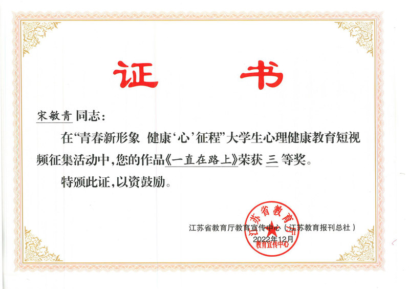 近日,由省教育厅教育宣传中心(江苏教育报刊总社)主办的“青春新形象 健康‘心’征程”大学生心理健康教育短视频征集活动评选结果公布。我校获“优秀组织奖”,据悉全省获奖学校仅二十所,法政学院学生宋敏青的作品《一直在路上》亦获佳绩。