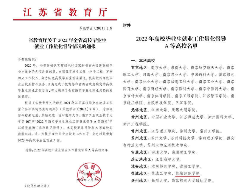 近日,江苏省教育厅印发《省教育厅关于2022年全省高校毕业生就业工作量化督导情况的通报》(苏教学函〔2023〕2 号),我校获评“2022年全省高校毕业生就业工作量化督导A等高校”,受到通报表扬。