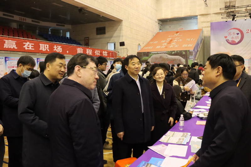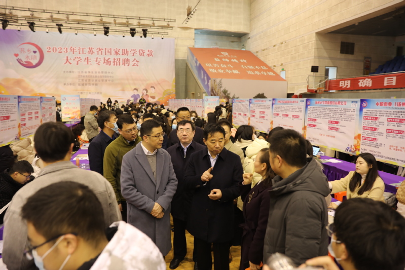学校党委书记戴斌荣,党委常委、副校长庞波,省招生就业指导中心副主任马杰,省资助管理中心副主任袁旭元,盐城市人社局、扬州市人社局领导深入招聘现场指导。