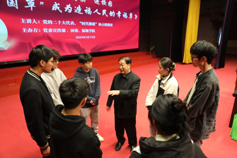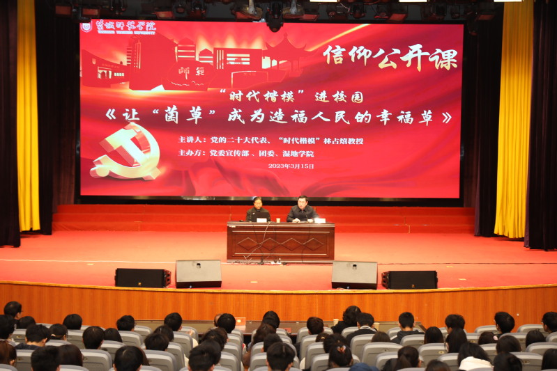 3月15日下午,我校新长校区大学生活动中心座无虚席。党的二十大代表、国家菌草工程技术研究中心主任、感动中国2022年度人物、福建农林大学教授林占熺应邀在此作“信仰公开课”主题报告,讲述他与菌草技术的不解之缘。学校党委常委、副校长庞波主持报告会。