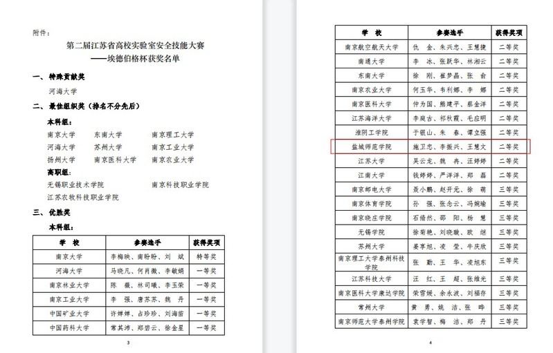 3月12日,由江苏省教育厅指导、省高等教育学会高校实验室研究会主办的第二届“江苏省高校实验室安全技能大赛”在南京农业大学举行。由我校化学与环境工程学院施卫忠、李振兴、王慧文老师组成的我校代表队首次参赛,与众多985、211高校同台竞技,在全省64所参赛高校中脱颖而出,荣获二等奖。